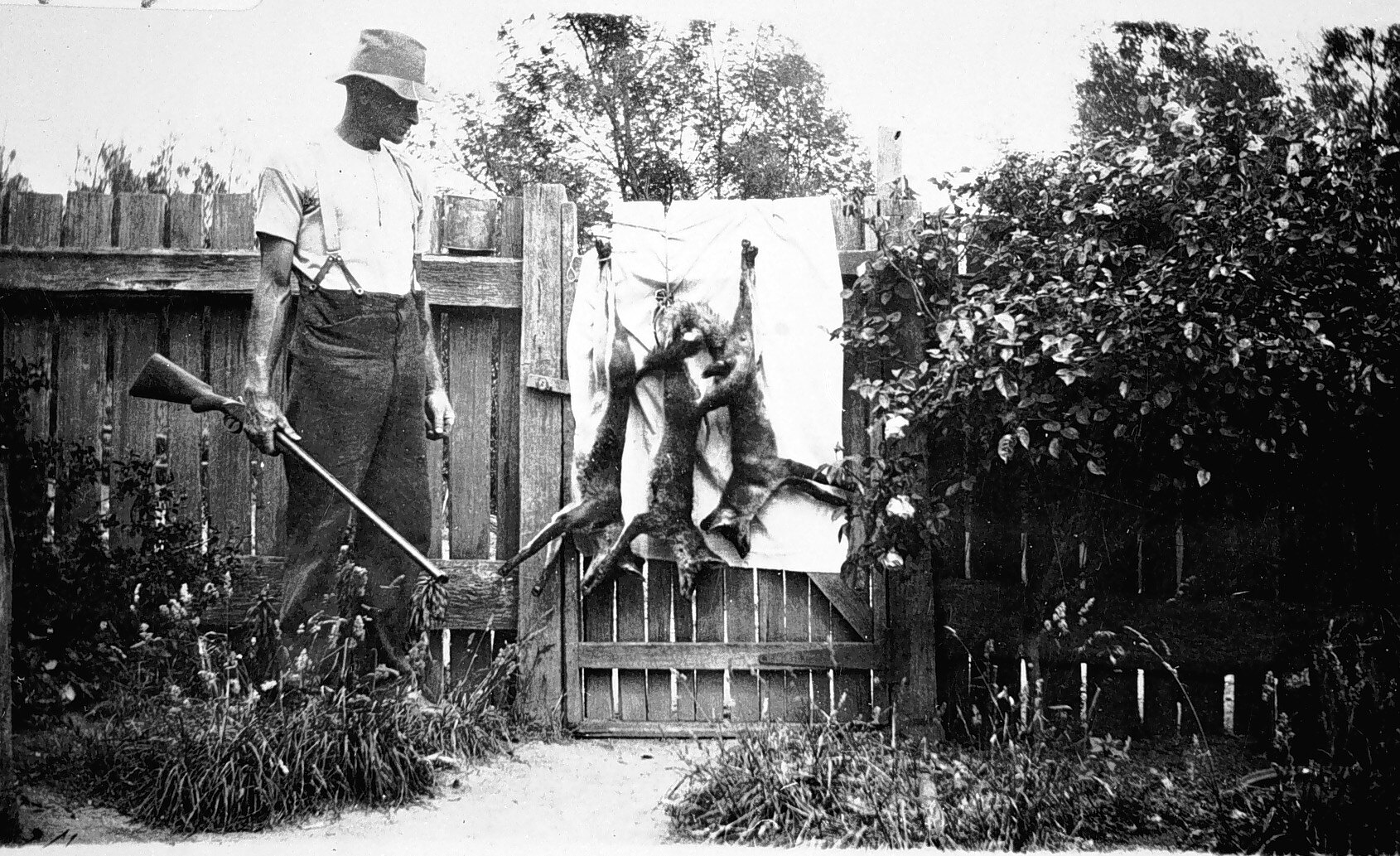 A man with three dead foxes strung up on a gate. The man is holding a rifle.