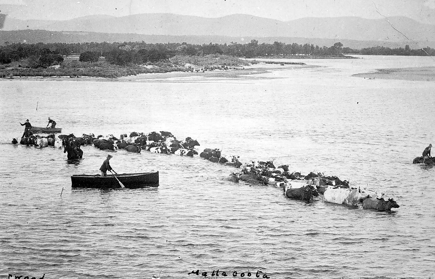 Cattle crossing the Mallacoota Lakes. They are being driven across by men in row boats.