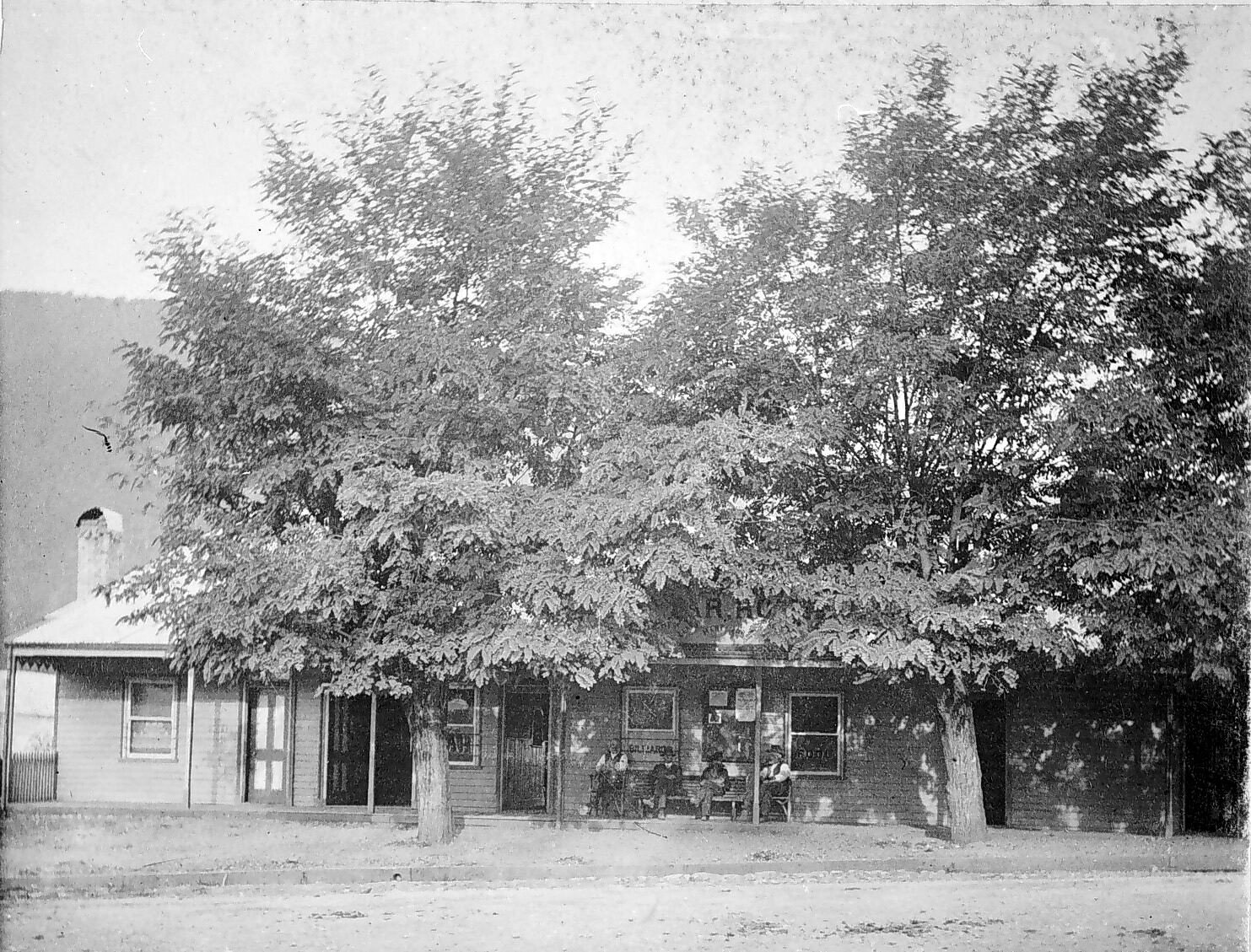 The Star Hotel. The hotel is shaded by two large trees and there is a group of men seated in front.
