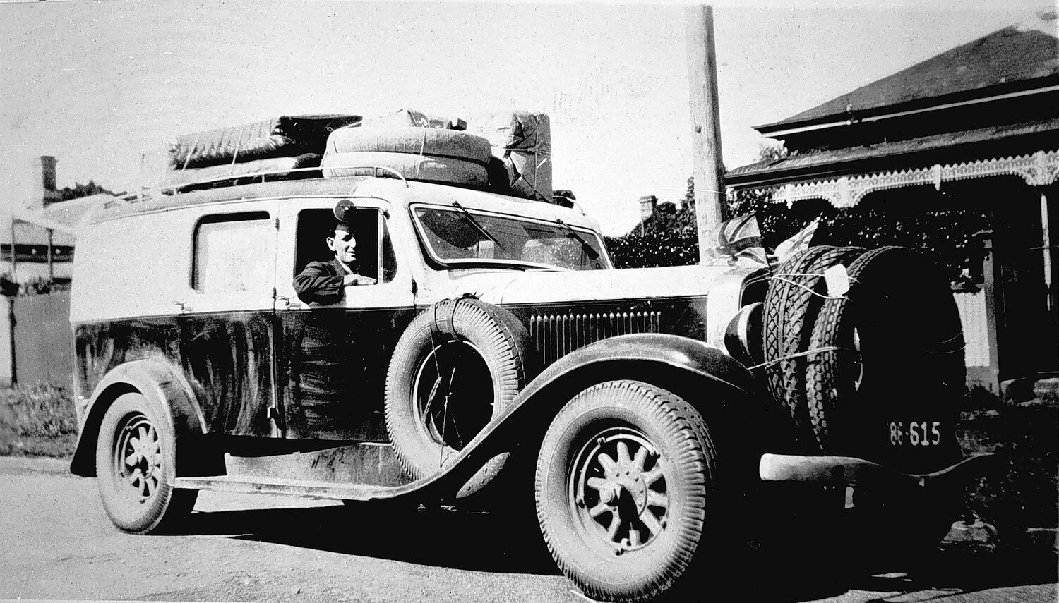 A van used for the Melbourne to Bairnsdale parcel and newspaper service there are three new tyres strapped to the radiator of the van. There appear to be two more tyres, wrapped, on the roof of the van.