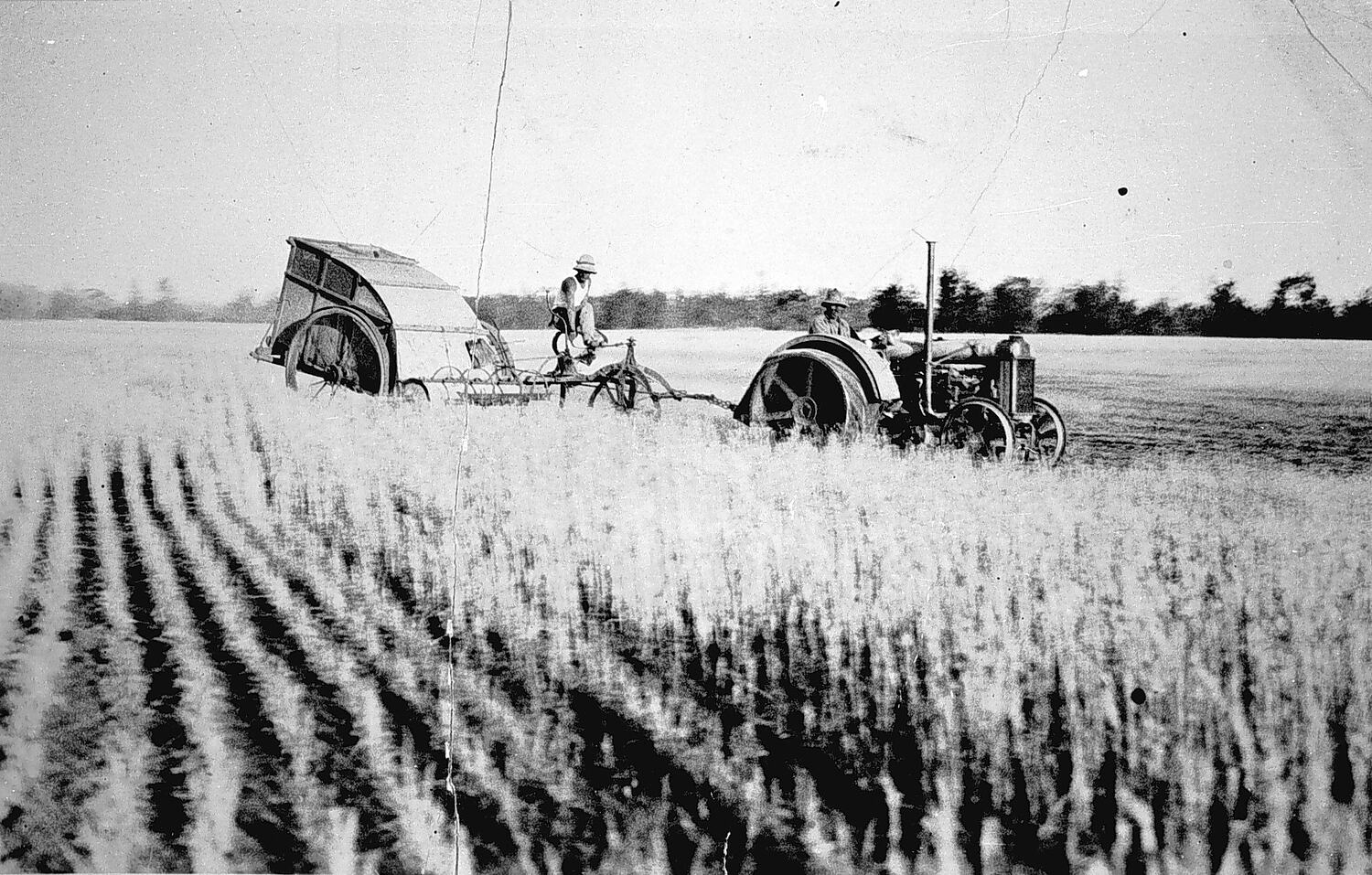 A note on the back of the photograph reads 'Fred Crichton's failed wheat crop' two men with a tractor and harvester. 5258.
