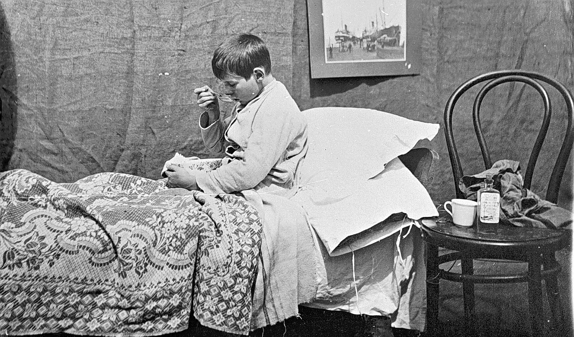A boy, in bed, eating from a bowl. There is a photograph of a pier on the wall behind him.