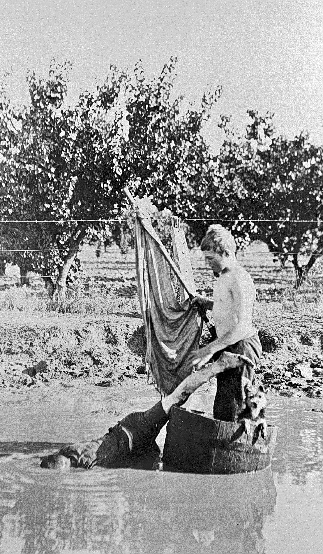 Two boys with barrel and sail in a water hole, one has fallen into the water. One of a series of images.