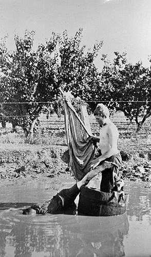 Black and white negative of two boys playing with a barrel and sail in a water hole, Merrigum, Victoria, 1910. Photographed by Lilian Louisa Pitts.