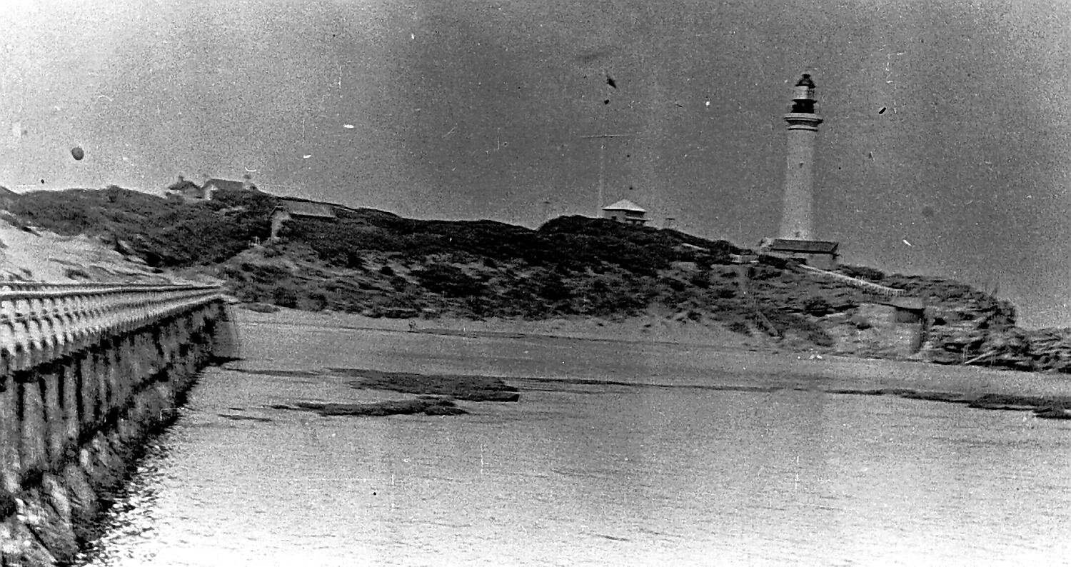 Lighthouse and beach. There is a jetty on the left.