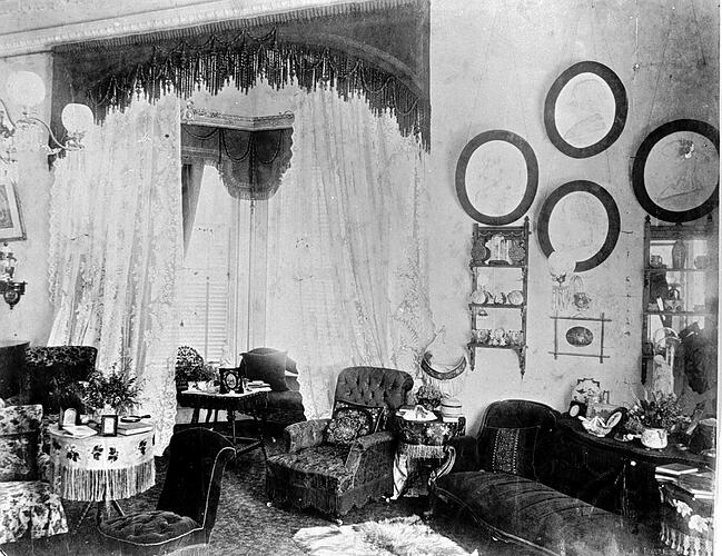 Believed to be the interior of the Thistle Inn, home of James Chisholm. A curtained alcove with easy chairs.