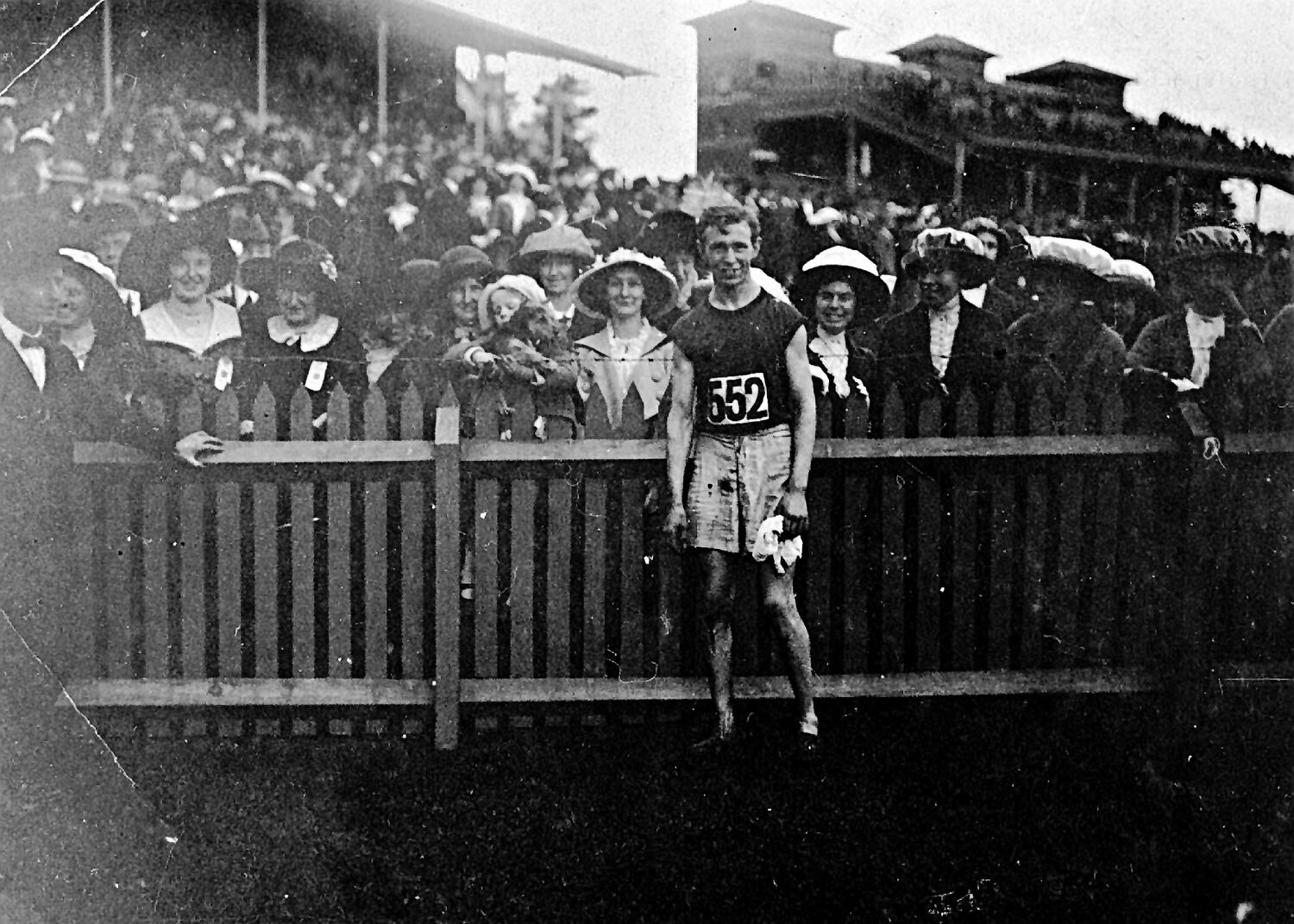 An athlete standing in front of the crowd at Caulfield Racecourse. He has just won the Victorian 10-mile championship.