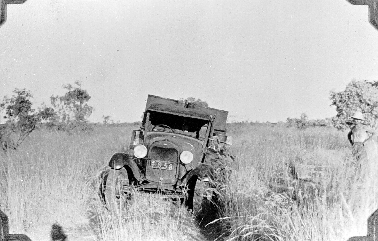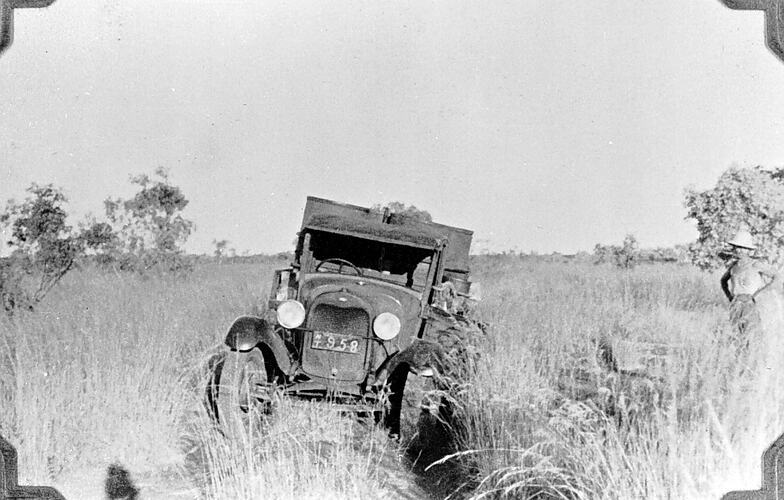 A truck apparently stuck in deep ruts on a track through tall grass.