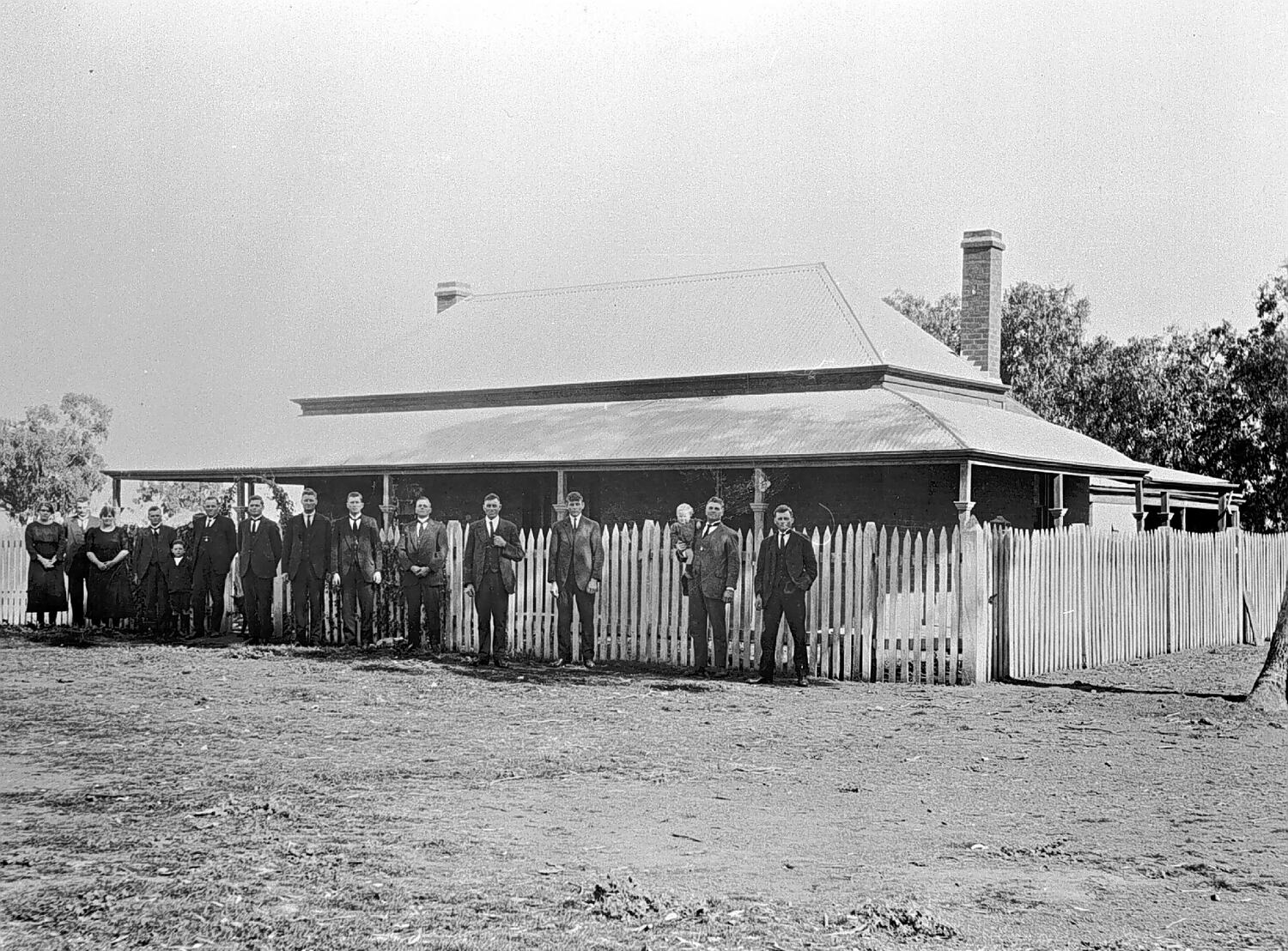 A group of people standing outside the fence of a house. The house has a verandah all around it.