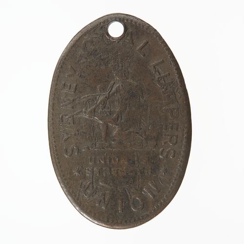 Plain (edge) SYDNEY COAL LUMPERS /* UNION * Figure of a coal lumper trying to break bundle, underneath UNION IS/STRENGTH (obverse) JAN/422 impressed (reverse)