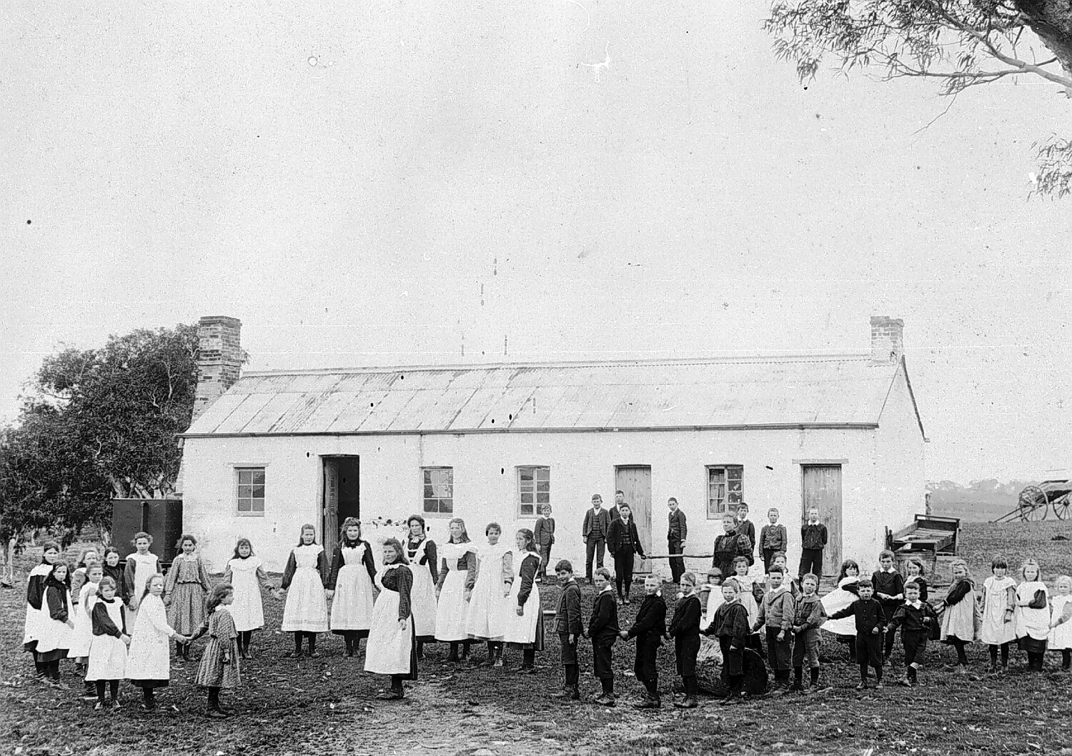 A school which was held in a men 's hut at 'Wando Vale' station until it was re-located to the Wando Vale hall in 1907 and then to a permanent school building in about 1908-09. The pupils stand in lines, all holding hands.