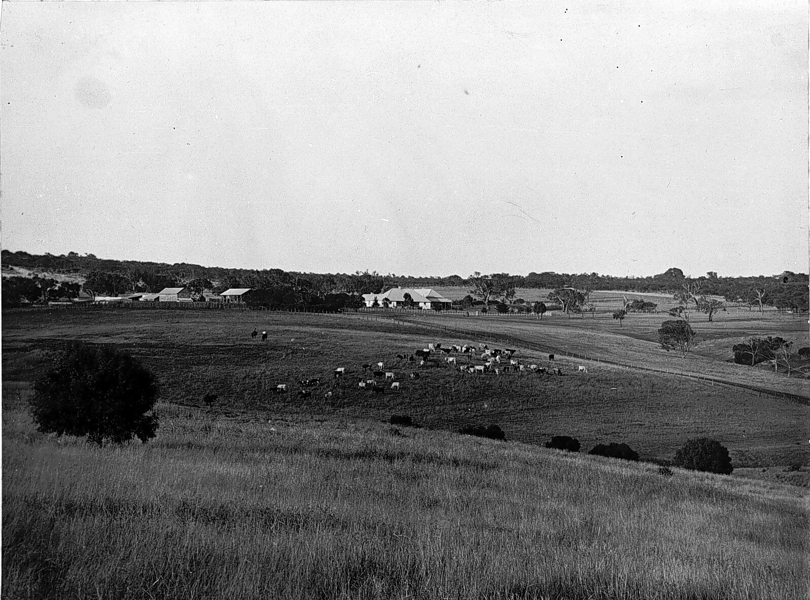 Pasture with farm buildings in the distance. There are cattle grazing in the centre of the photograph.