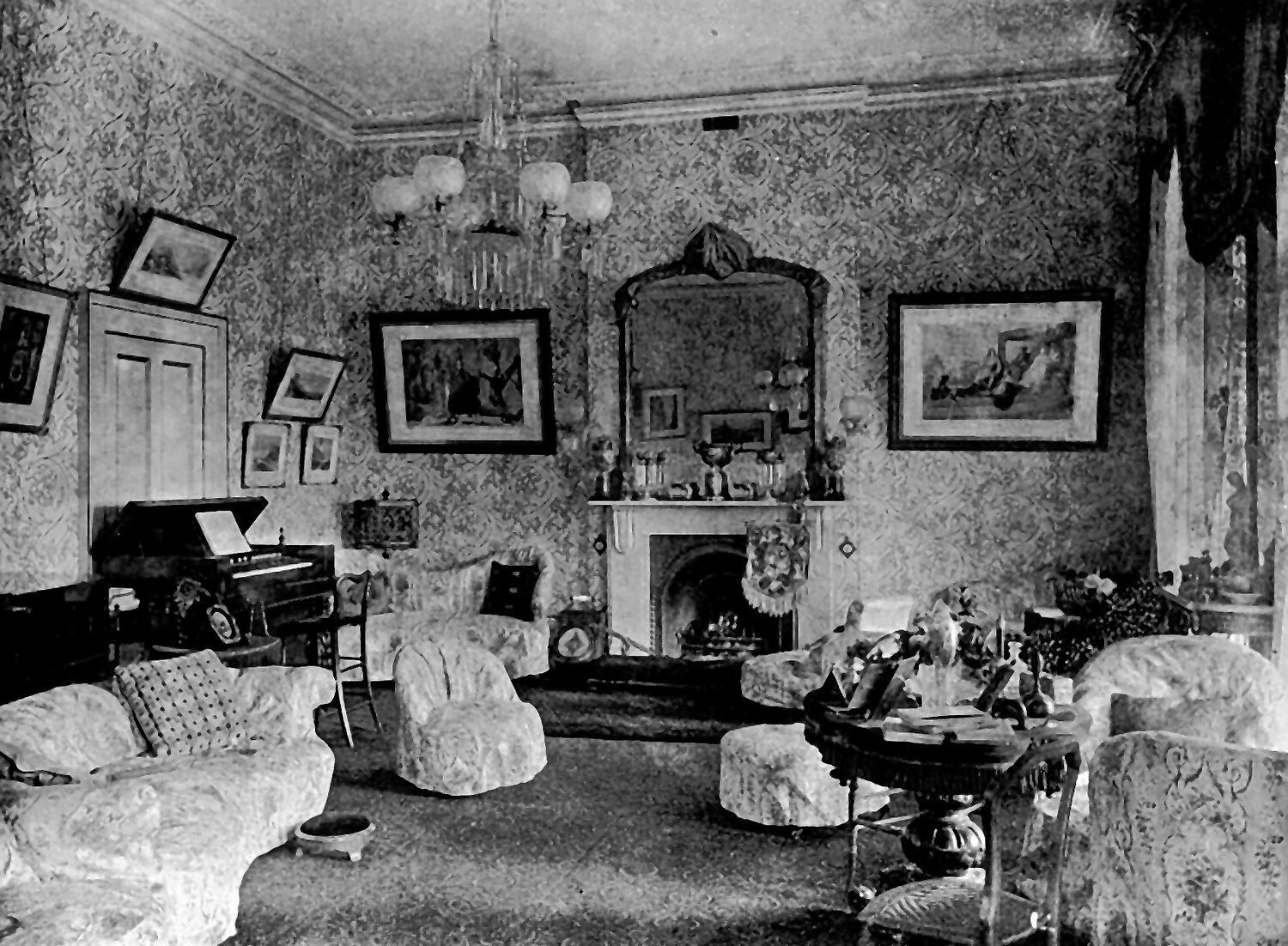Believed to be the interior of the Thistle Inn, home of James Chisholm. A drawing room with piano, sofa and lounge chairs.