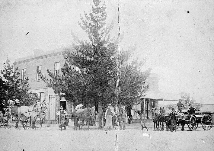 Men, horses and carts outside the general store in Lyonville. (There is an earlier view of this street corner in MM 003530).