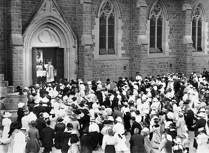 The opening of the Sacred Heart Cathedral. An altar has been constructed in the entrance and the congregation are kneeling outside the cathedral.