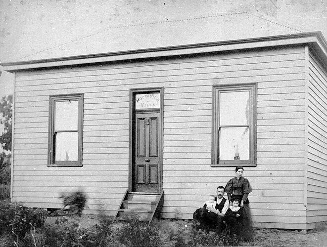 A man and woman with a small girl and a baby outside their home which has the name 'Moora View Villa' above the door.