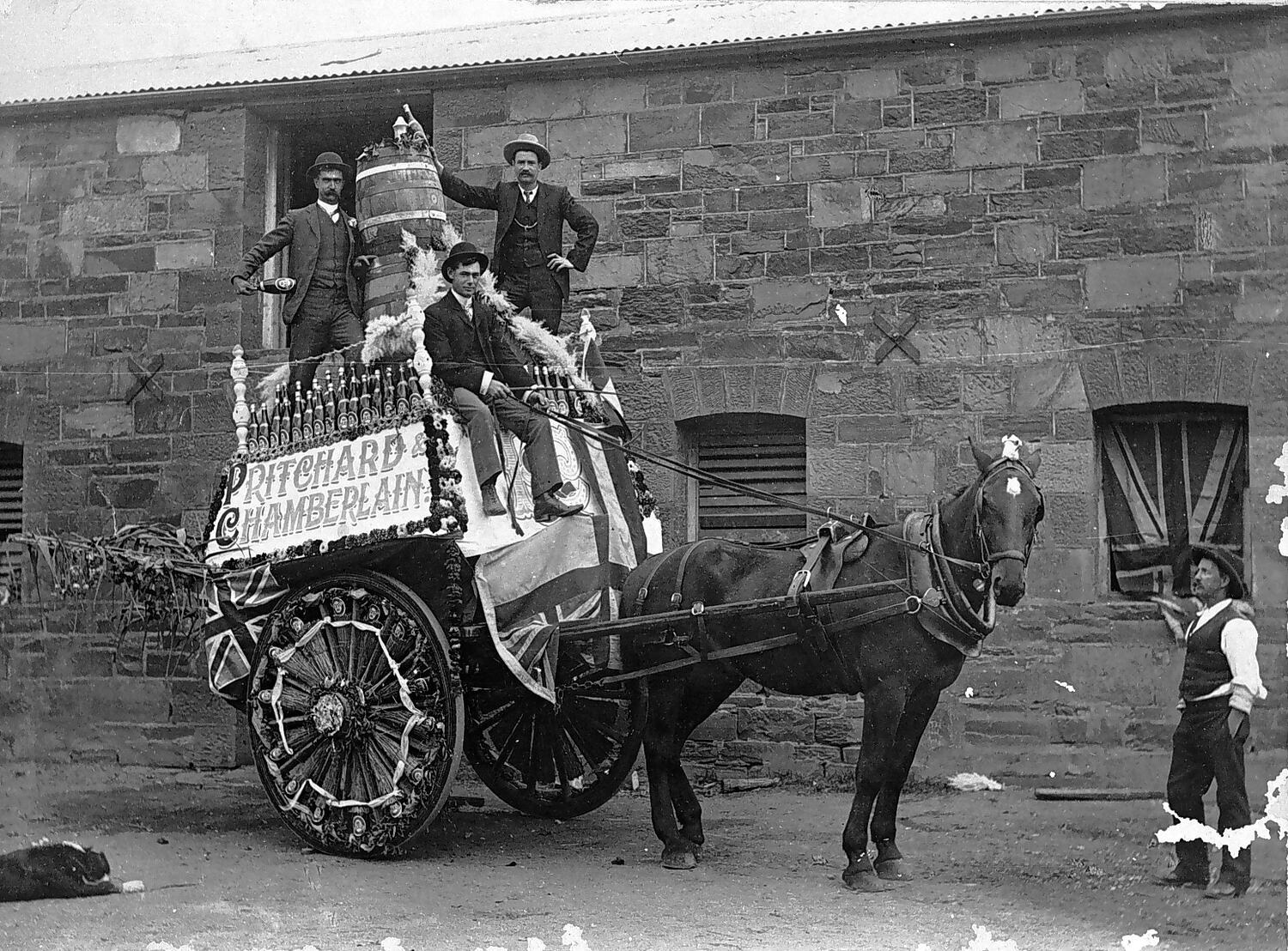 A decorated carriage from the Pritchard & Chamberlain Brewery preparing to take part in a procession. The brewery is in the background.