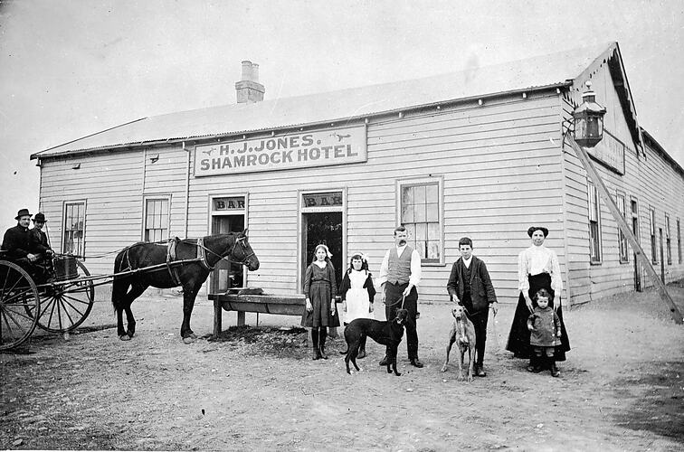 The hotel owner and his family in front of H.J. Jones ' Shamrock Hotel. There are two people in a horse and cart on the left while the owner and his son (?) Both hold greyhounds. There is a large street light attached to the corner of the hotel. (see also MM 004294).