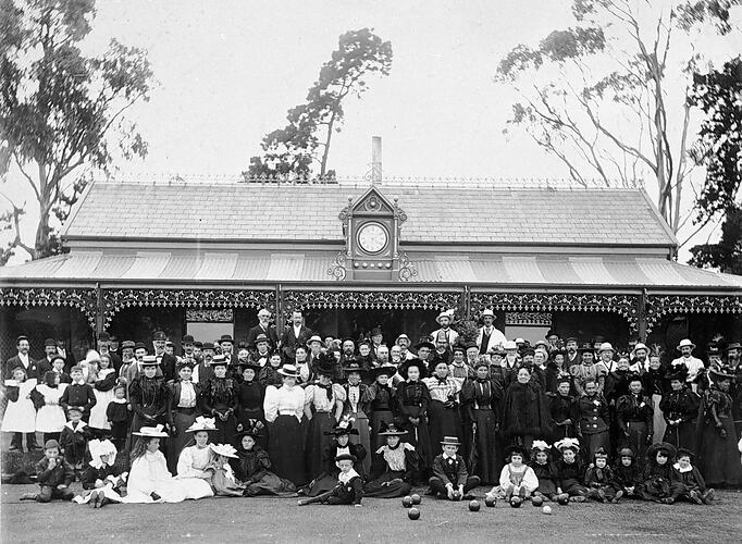 A group of women, men and children in front of the pavilion at the Gisborne Bowling Club.
