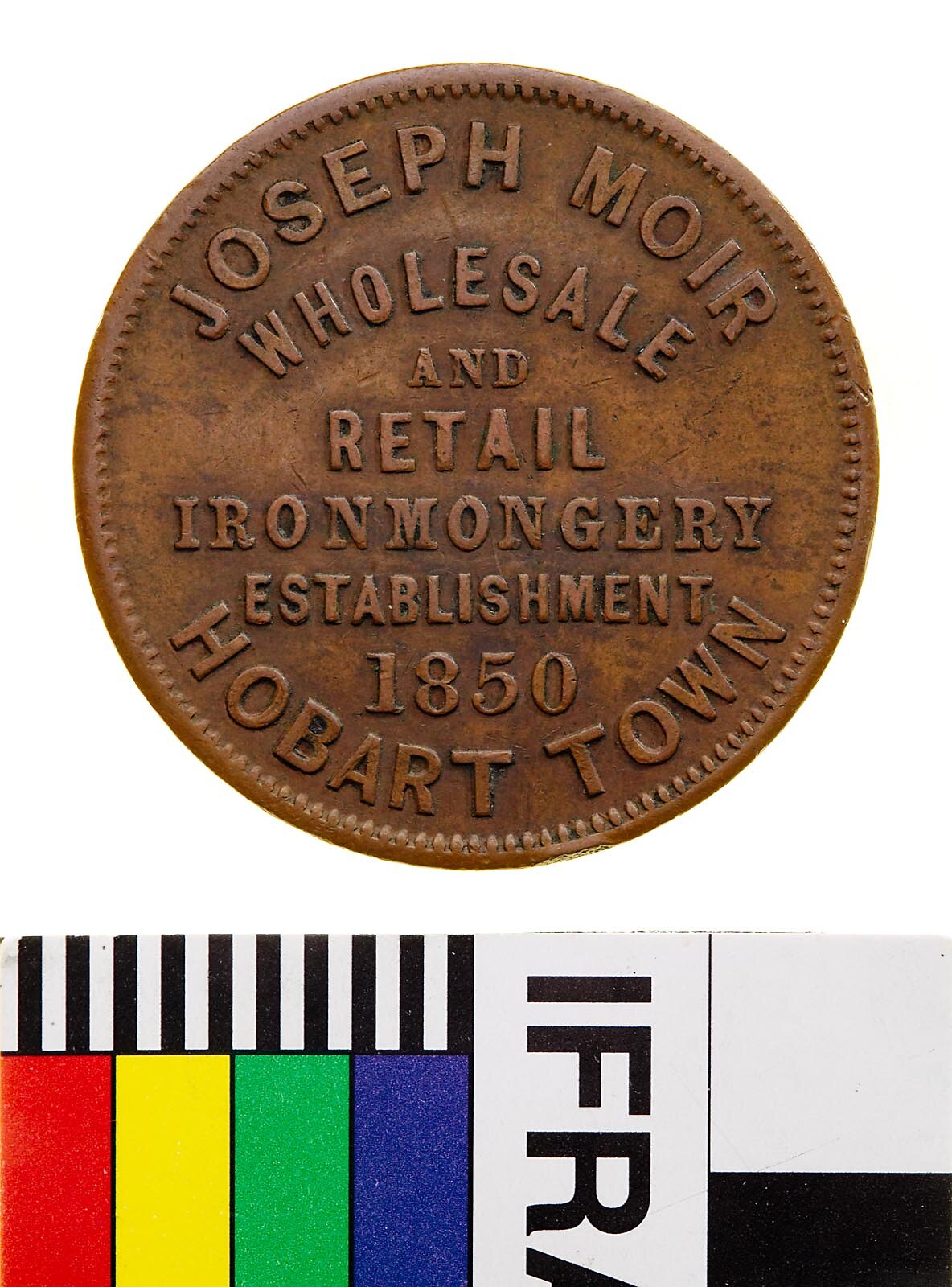 A round copper token (34 mm diameter) featuring the name, address and business of the company which issued the tokens: Joseph Moir, Economy House, Murry [sic] St., Hobart Town, Ironmongers.