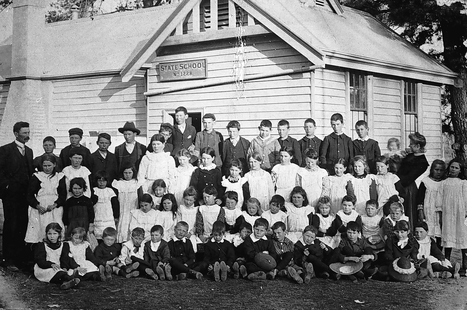 Teachers and pupils outside the Sarsfield State School No.1228.