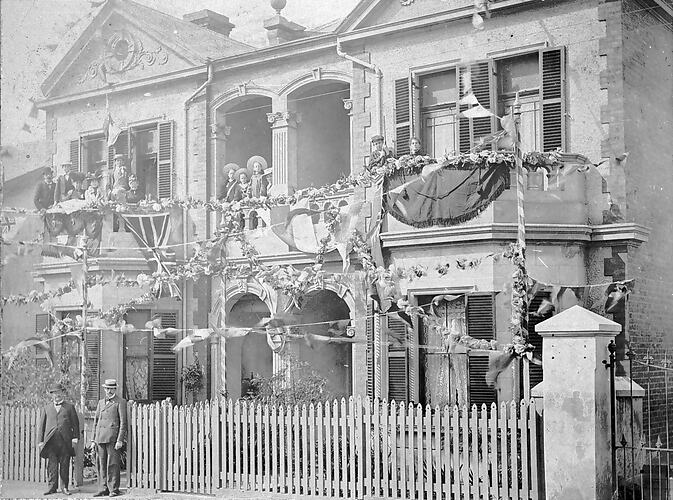 People in a house strung with bunting waiting for the royal carriage to pass this would have been for the then Duke and Duchess of York (later King George V and Queen Mary).