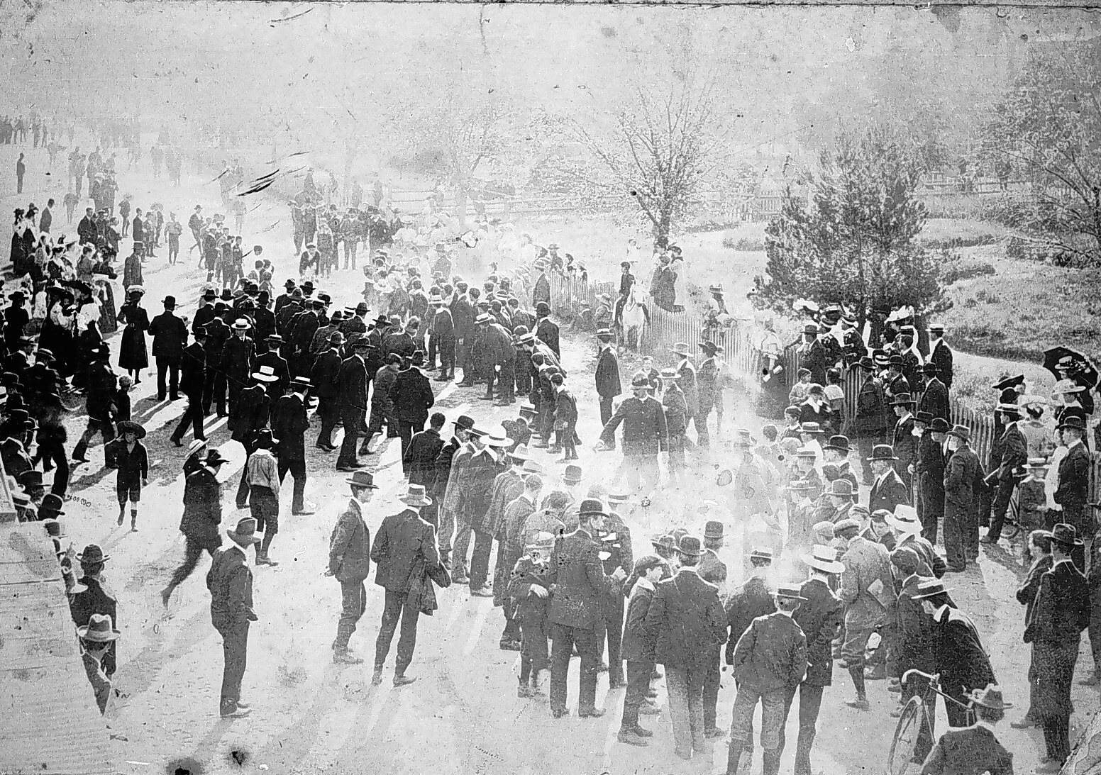 The finish of a cycle race. The leading rider appears to be in the upper left of the photograph.