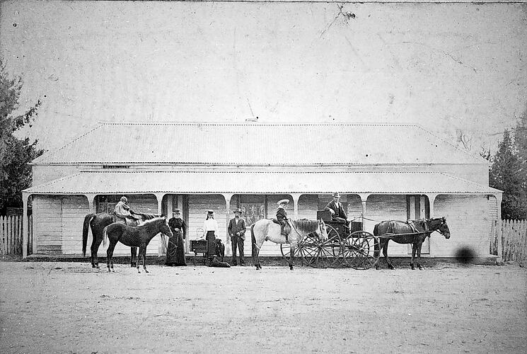 A group outside the Cherry Tree Hotel. There is a man in a carriage on the right, two children on horseback and a man and two women in front of the hotel.