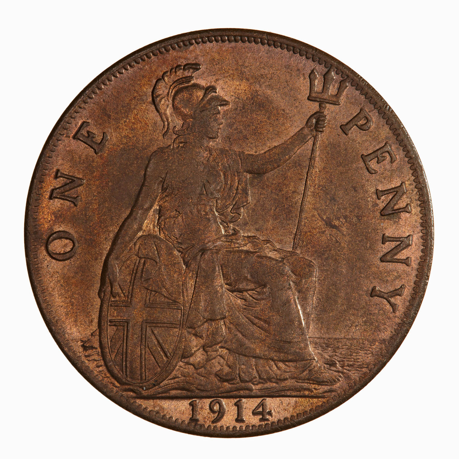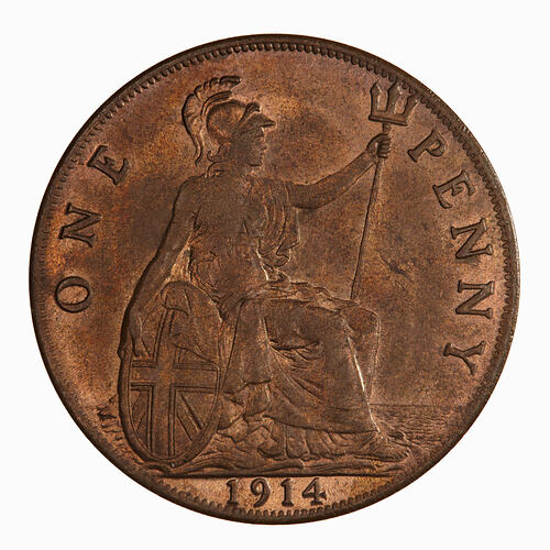 Britannia seated facing right on a rock wearing a helmet and flowing robes; she holds a trident and rests her right hand on a shield which bears the combined crosses of the Union Flag; around, ONE PENNY; in exergue, 1914