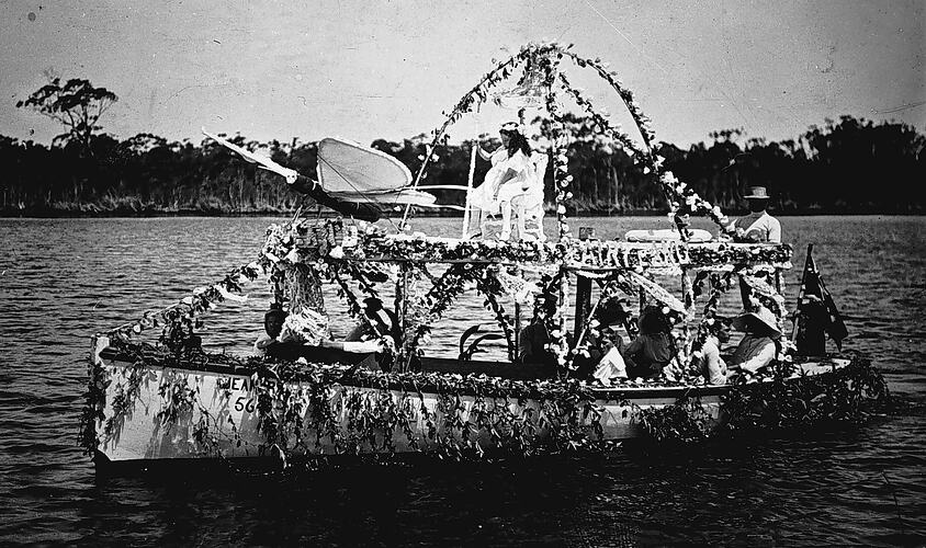 A boat which has been decorated for New Year's Eve. There is a woman seated on top of the awning and a sign appears to read 'Fairy Band'.