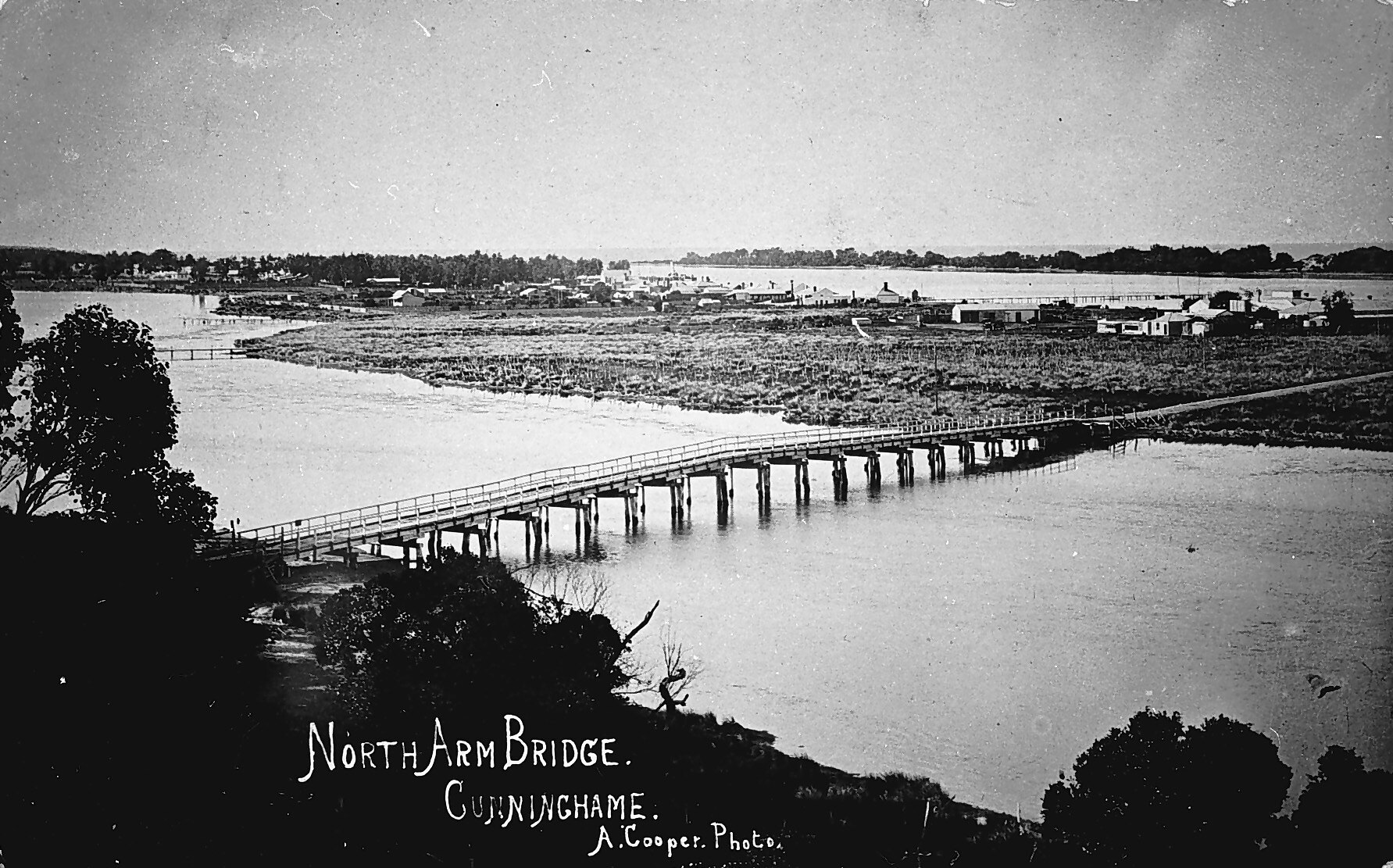 The North Arm bridge with the town of Cunninghame beyond.