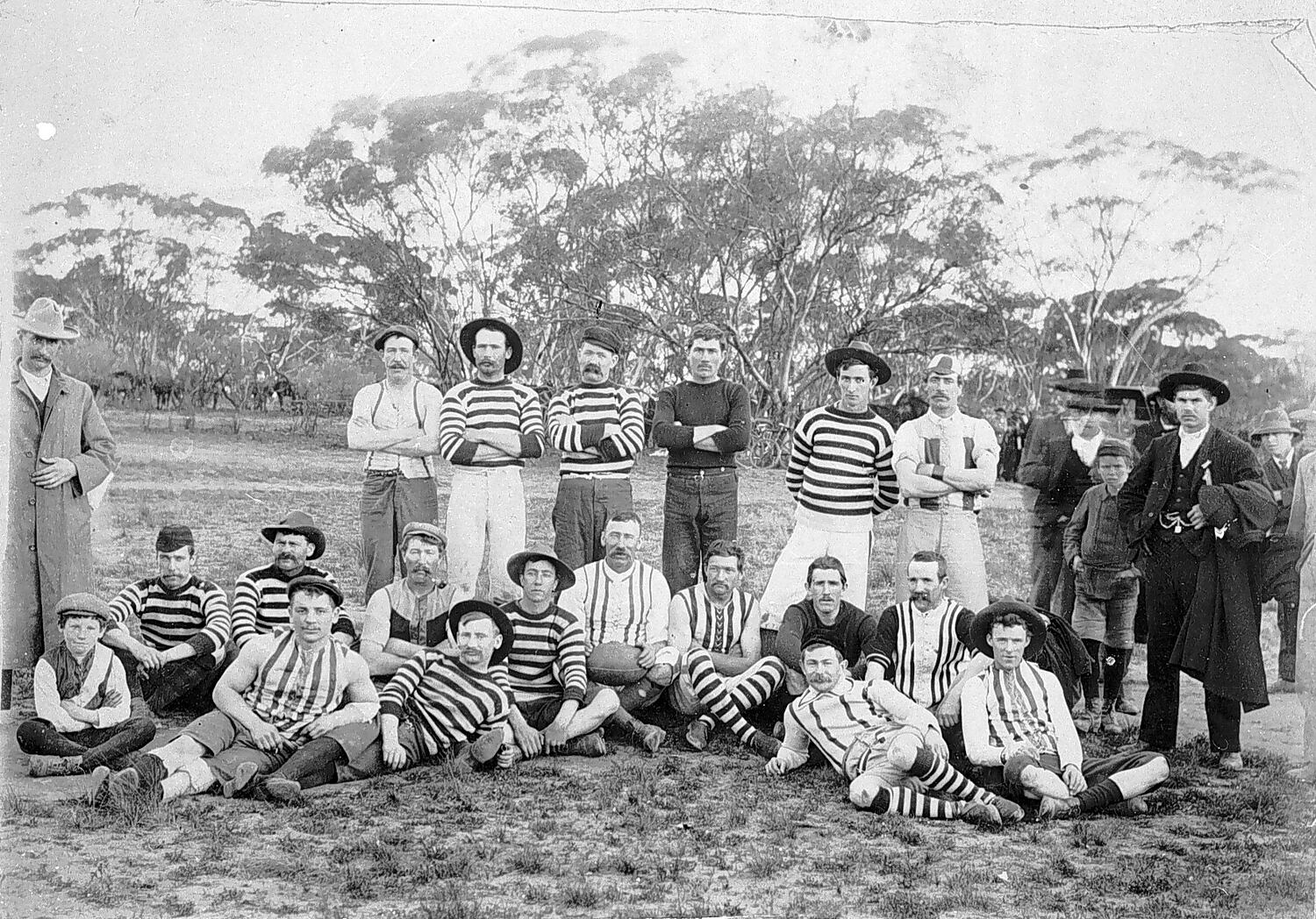 The Sea Lake football team. Some wear jumpers with horizontal stripes and some with vertical stripes. There is a variety of styles.