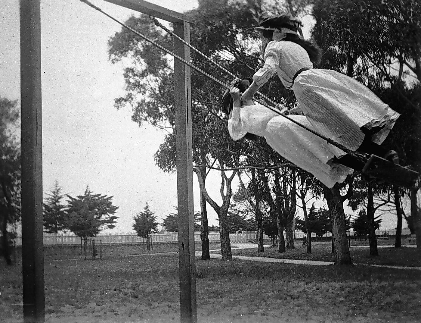 Two girls swinging high on a swing.