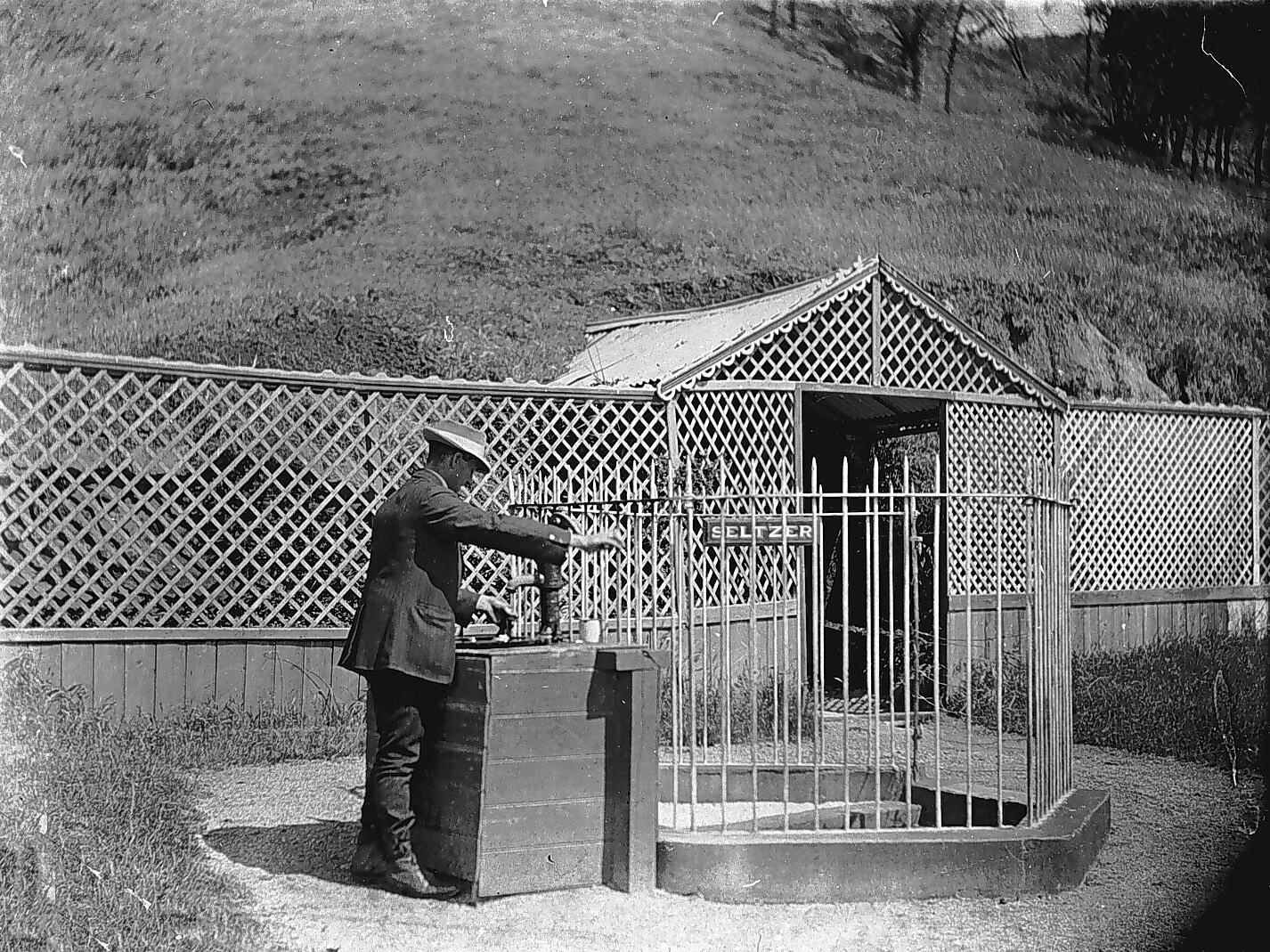 A man pumping mineral water at a spa. A sign in the background reads 'Seltzer'.