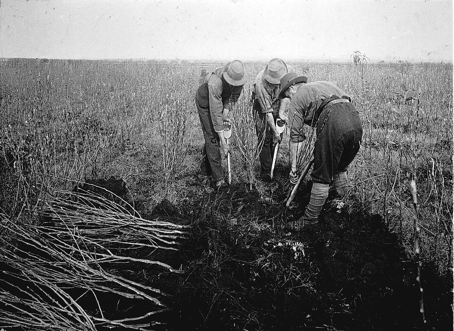 Three men digging up trees for export at the C.J. Goodman Fruit Tree Nursery.