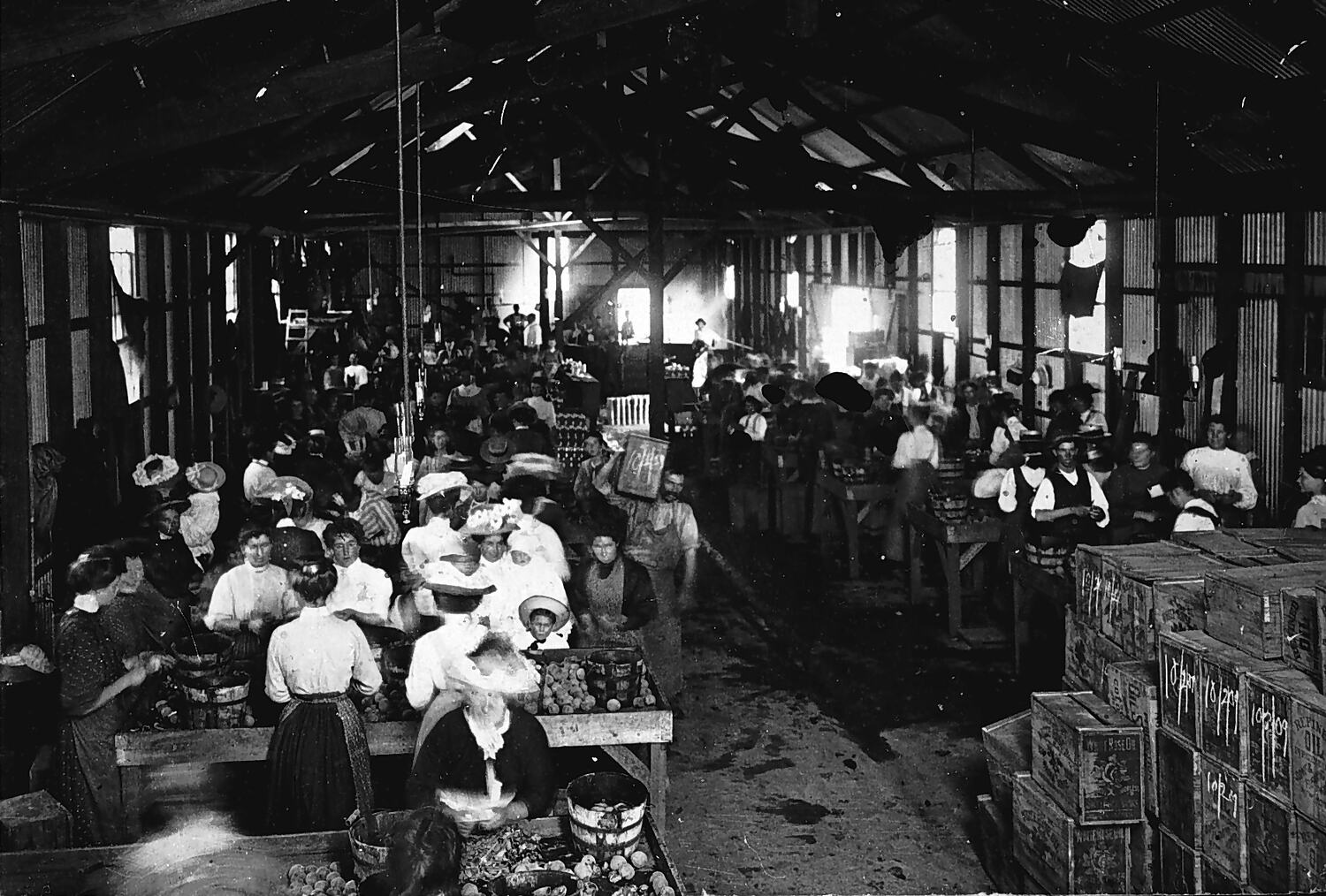 A group of workers, largely female, peeling and slicing peaches in a large corrugated iron shed which was part of a cannery. Many of the women wear hats.