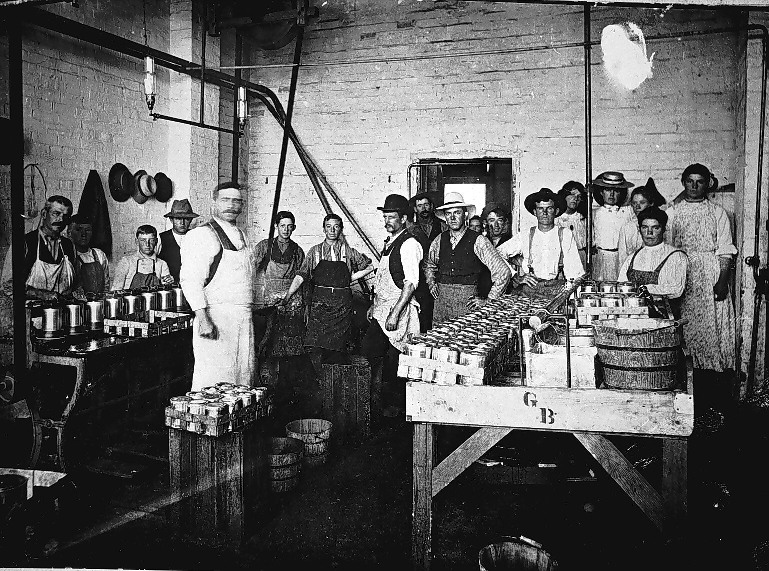 A group of workers, predominantly male, inside a cannery. There are crates of cans on the benches.