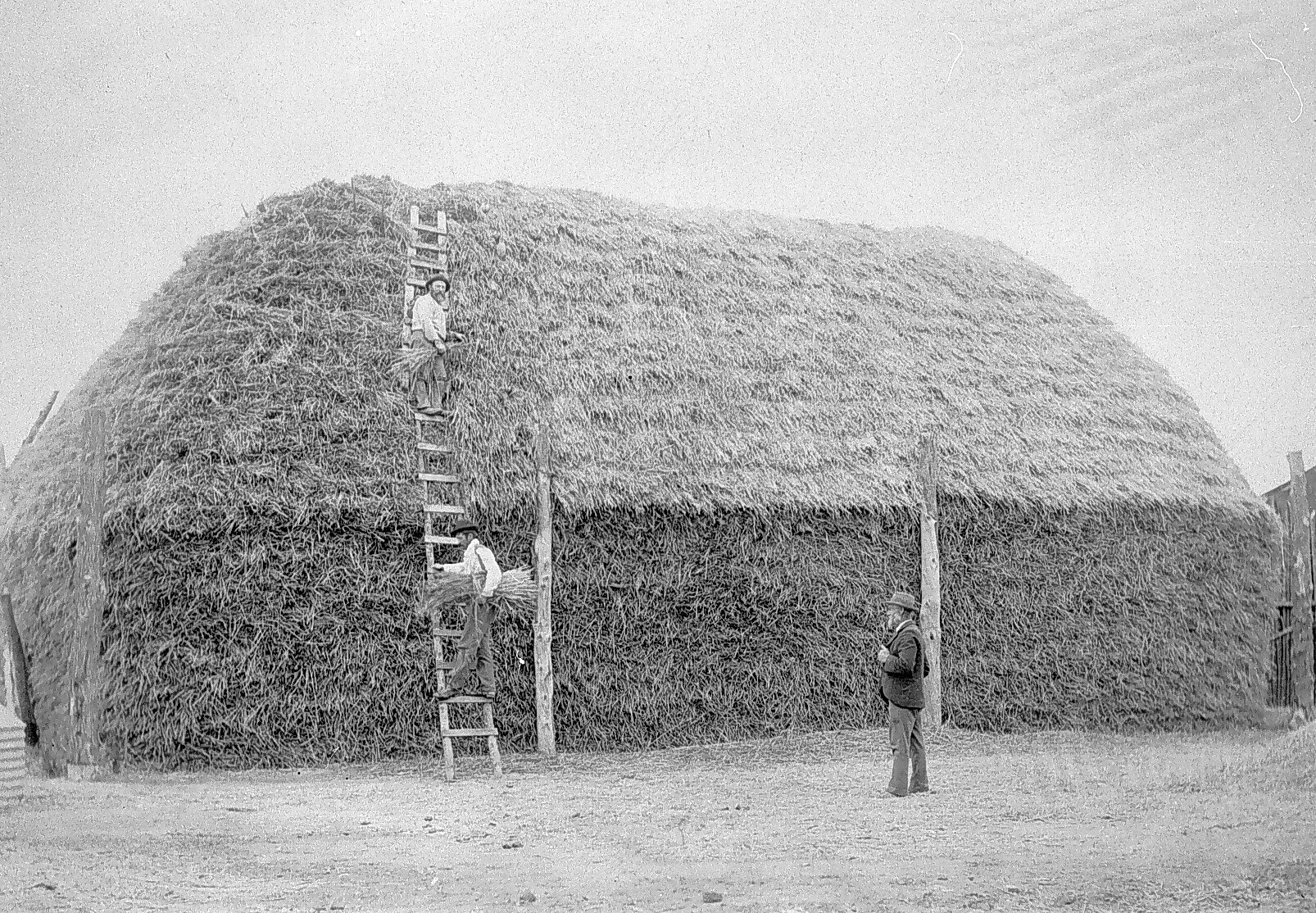 Men thatching a haystack.