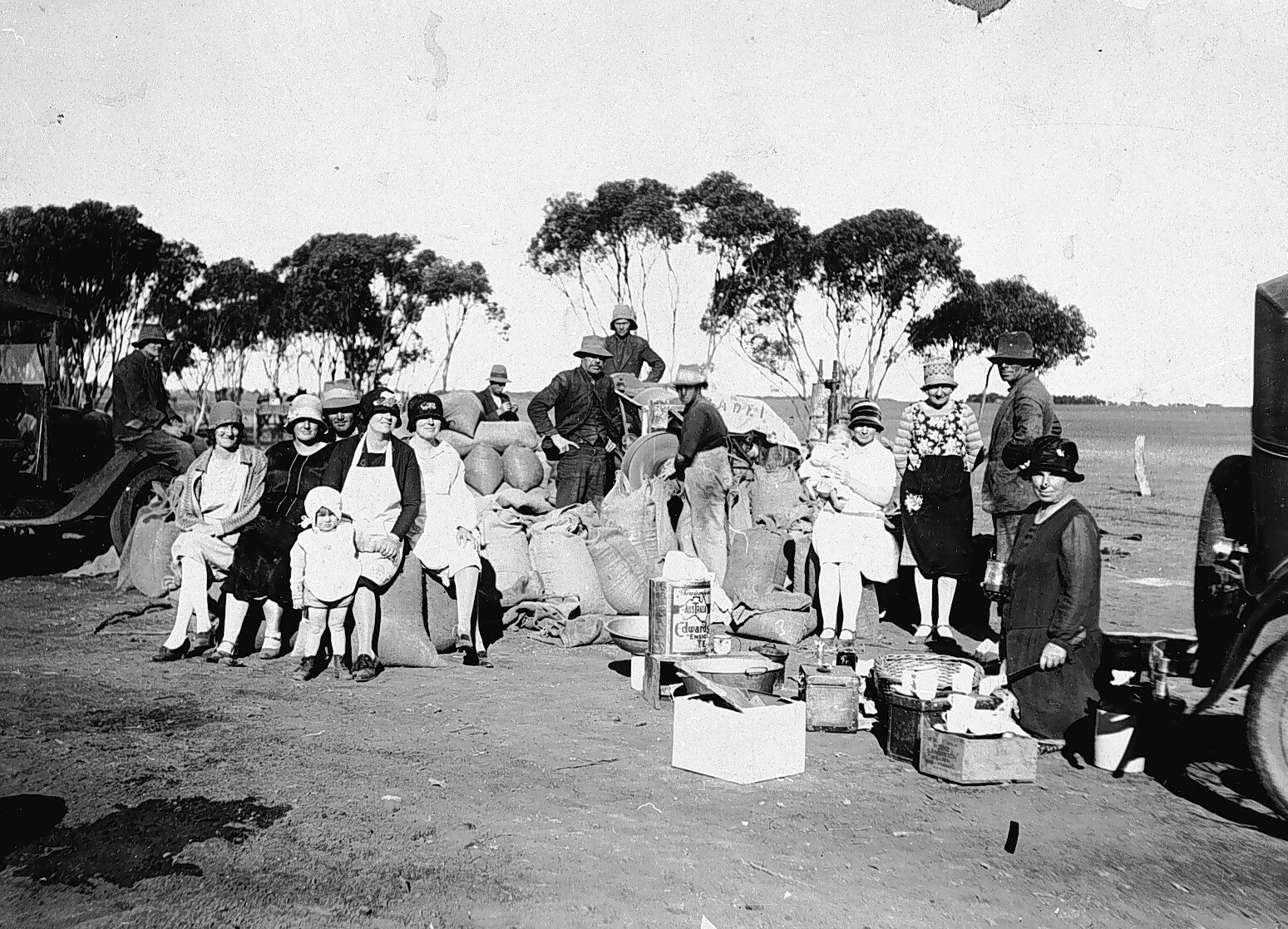 Tea break on a farm. There are cars on the left and right, agricultural machinery and a stack of filled sacks in the background. In the foreground are a number of women and children with food supplies.