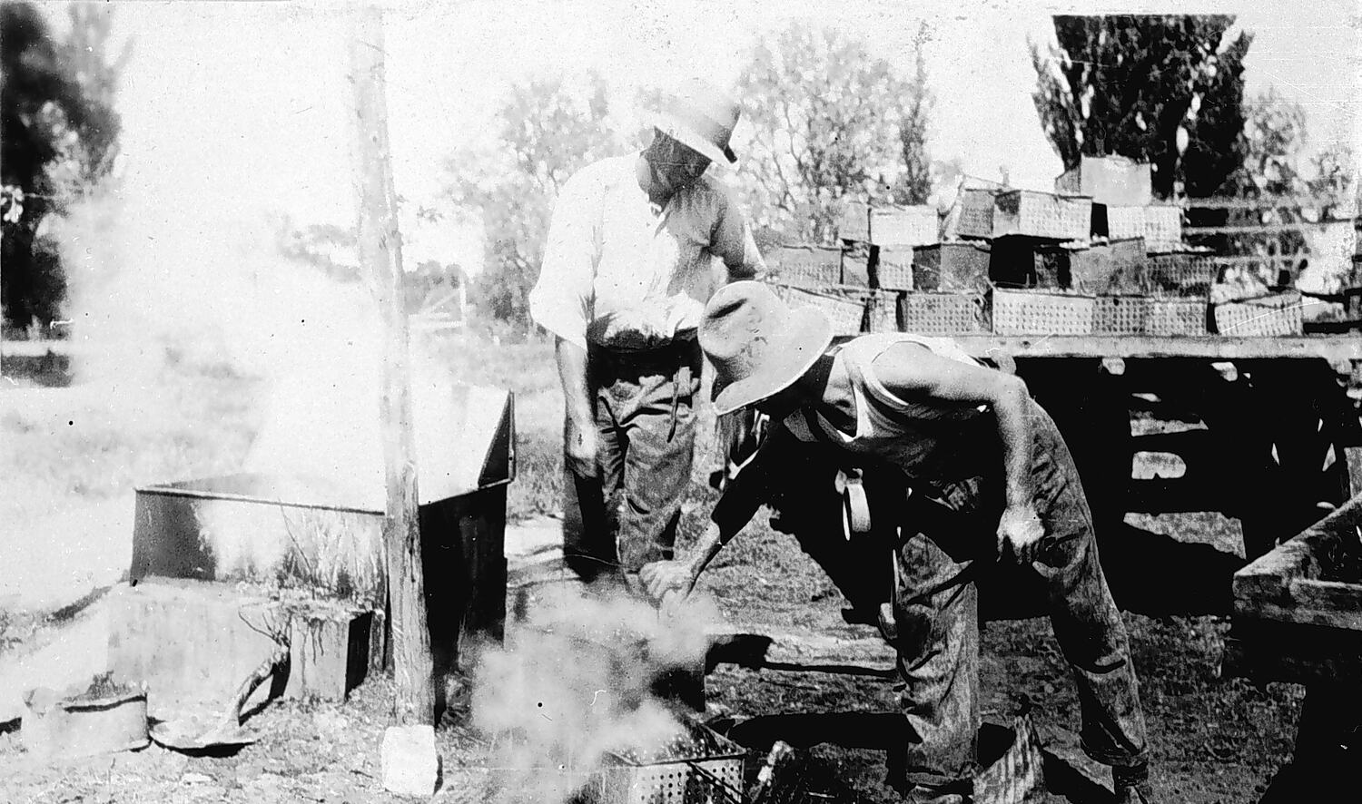 Two men using the old method of hot dipping and drying sultanas.