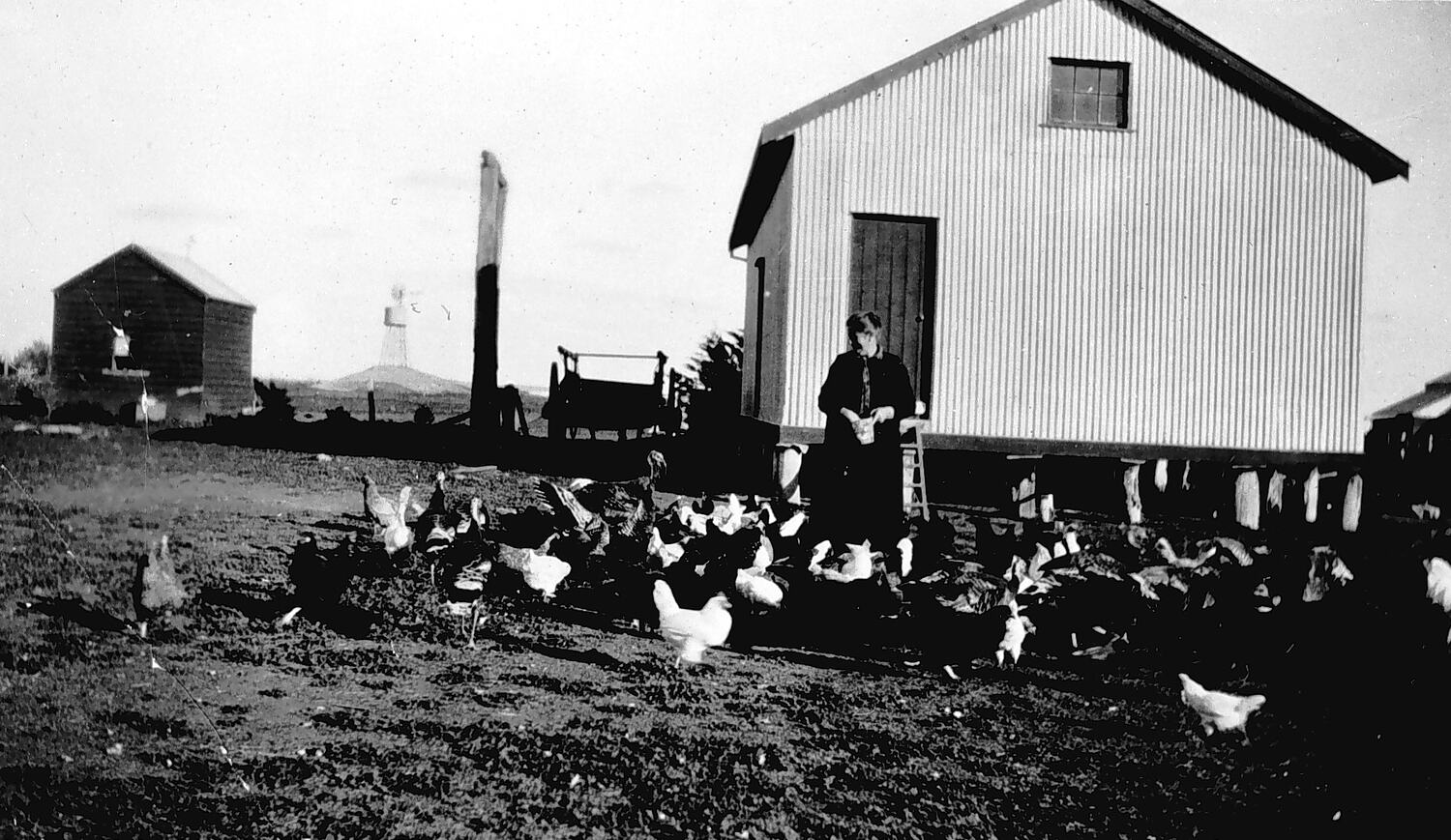 A woman feeding poultry. There is a corrugated iron building behind her.