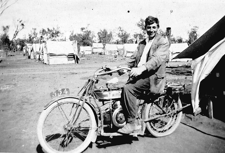 A young man on a motorbike at 'Tent Town'.