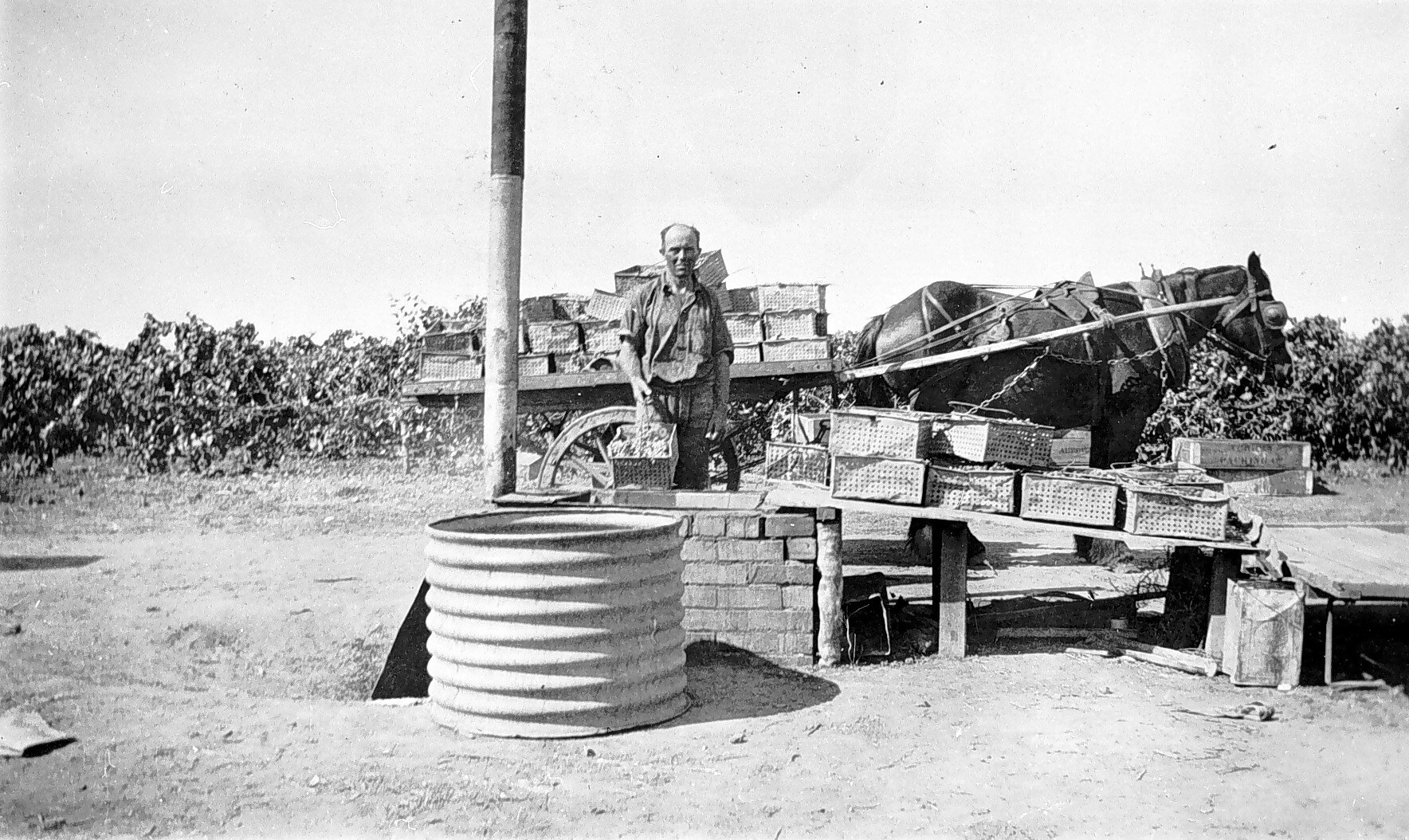 A man hot dipping grapes on block 66. There is a horse and wagon behind him and grapes vines in the background.