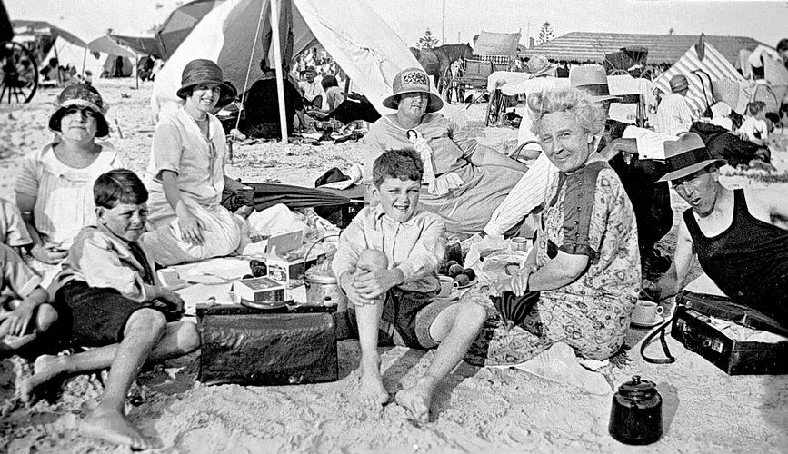 A family picnic on Glenelg beach. There are horse-drawn carts and tents in the background.
