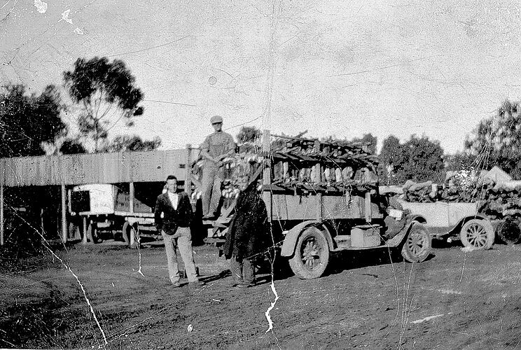 Three men with truck load of rabbits. There is a car and a truck under cover in the background.