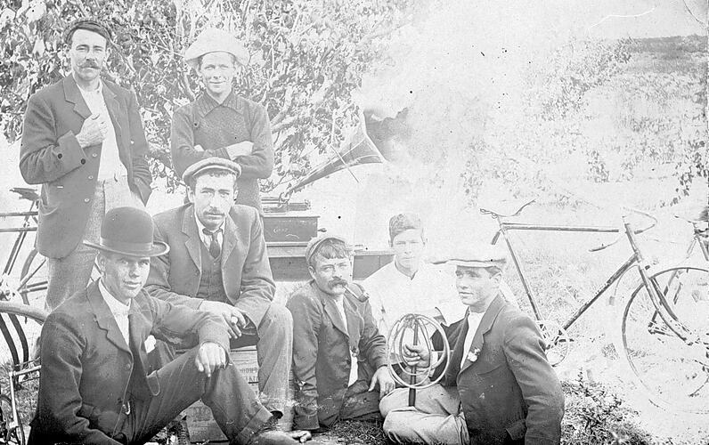 Group of men with bicycles and a gramophone. One man is holding a coiled stockwhip.