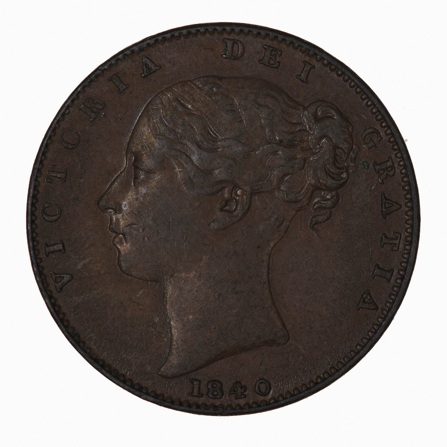 Head of the Queen facing left, hair bound in double fillet gathered behind in a knot from which a loose curl; on neck truncation raised, W.W. (for William Wyon, who designed and engraved the dies); around, VICTORIA DEI GRATIA; below, 1840