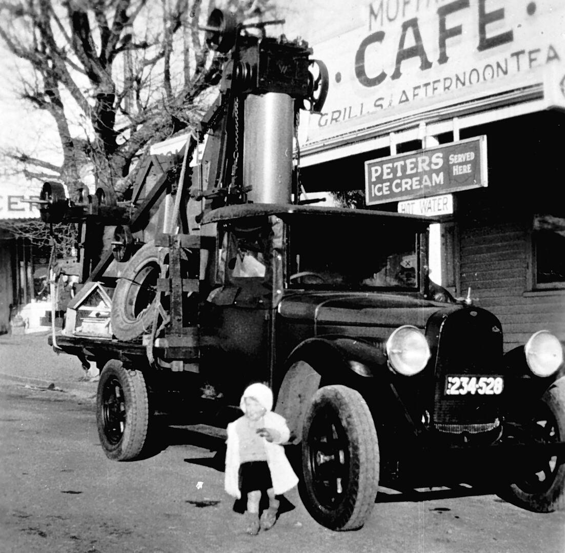 Chaffcutter on a Whippet truck. The truck is parked outside a cafe and there is a small child standing beside the wheel.