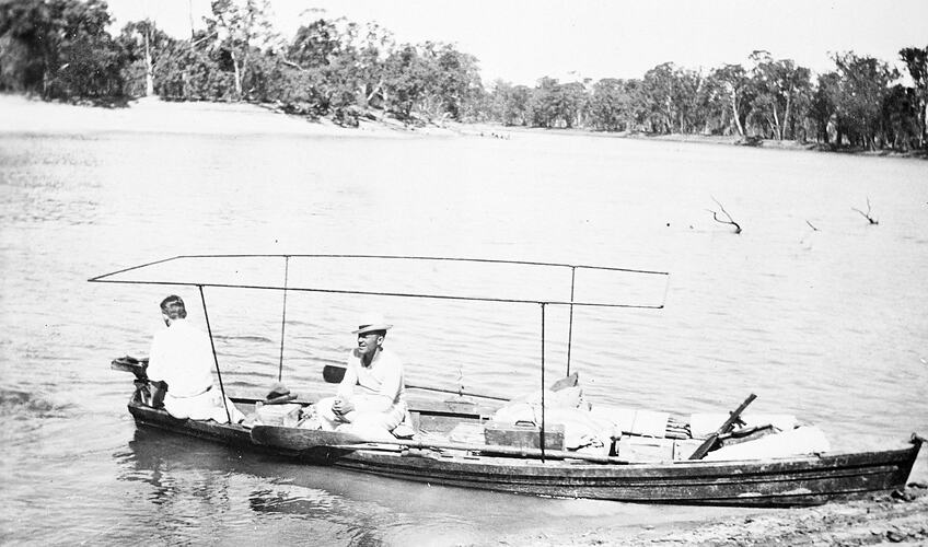Two men in a boat drawn up by the bank of the Murray River. The boat has framework for an awning.