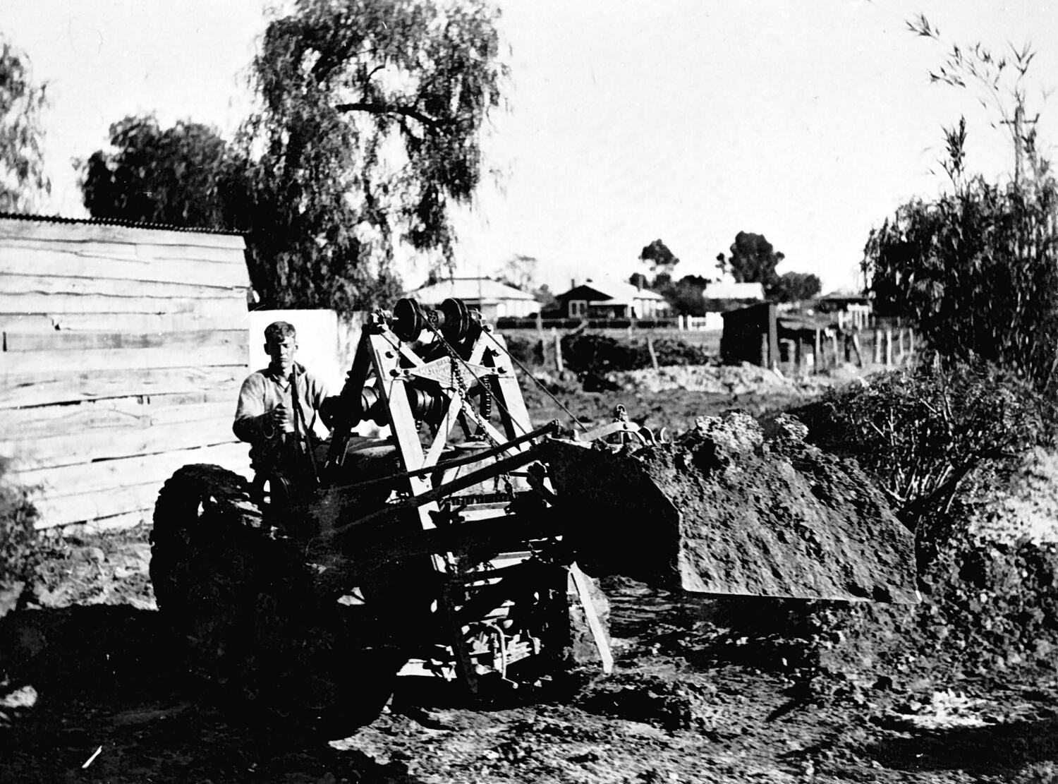 A man driving a tractor fitted with what appears to be an early version of a front end loader. There is a deep excavation on the right,.
